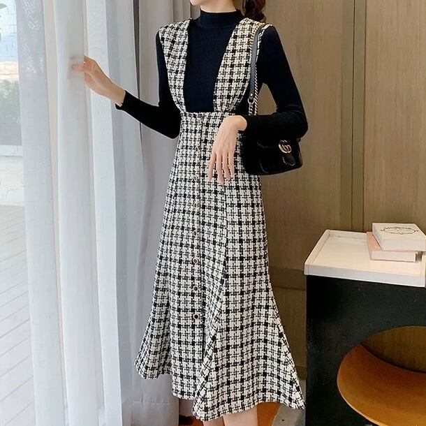 柄域大きめのツイードの上品なチェック柄と、一枚でお洒落見えが叶うジャンパースカートの組み合わせは、トレンド感と可愛らしさを兼ね備えた大人の女性におススメです。
